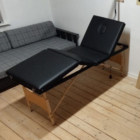 Pæn brugt briks med brugsspor, som vist på billeder. Nakke- og ansigtspude aldrig brugt og stadig i plastic