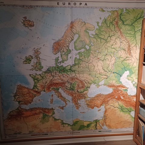 Ældre Europakort som har synlige brugsspor og mangler rundstok eller lignende til ophæng.