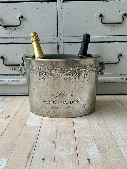 Stor gammel fransk champagnebowle Pommery - fransk vintage, Super cool og dekorativ gammel fransk champagne køler / champagne bowle fra det hæderkronede gamle champagnehus Pommery lavet til deres fantastiske Cuvée Louise champagne. Champagnekøleren fremstår i lækker tin med en helt perfekt patina! Med champagneproducentens logo indgraveret på begge sider og med afbildning af Madame Pommery Louise i art nouveau stil på de modsatte sider. En stor og rummelig køler med god plads til 6-8 champagneflasker. En virkelig imponerende flot champagnekøler!