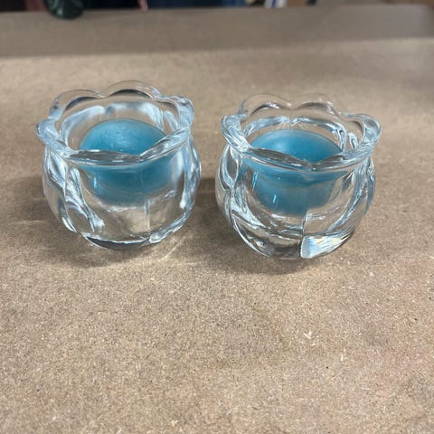 2 fyrfadsstager i glas med metalkant. Ø. 8 cm.
