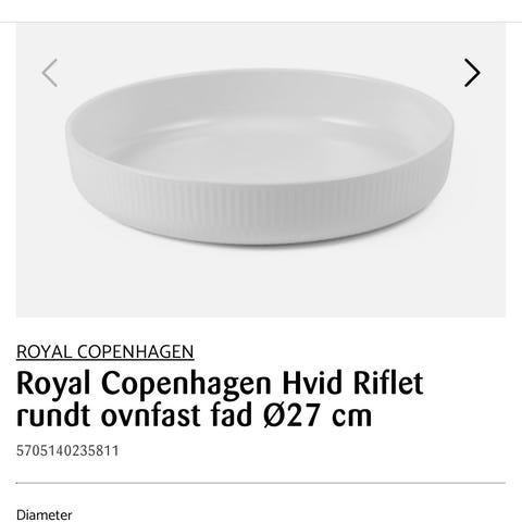 Royal Copenhagen Riflet oval fad i hvidt porcelæn. Fadet har en riflet kantdetalje og en glat overflade. Velegnet til servering af mad ved forskellige lejligheder.