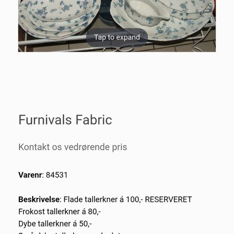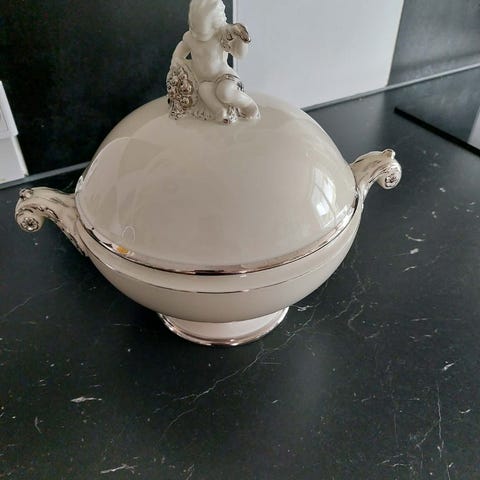 Jeg foretrækkerat du afhenter, da jeg er bange for brud, og det ville være SÅ ærgeligt med denne smukke store suppe terrine. Men kan du ikke selv hente da pakker jeg godt men vil kun have tak og ikke skæld ud hvis den smadres i fragt obs dette.