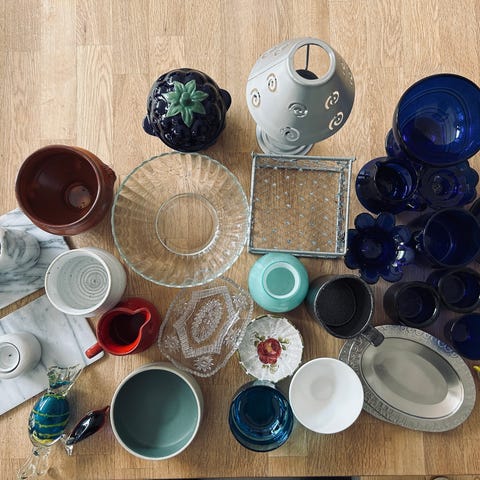 Reol fyldt med lidt af hvert – pynt, køkkenting, boligting, retroting m.m.