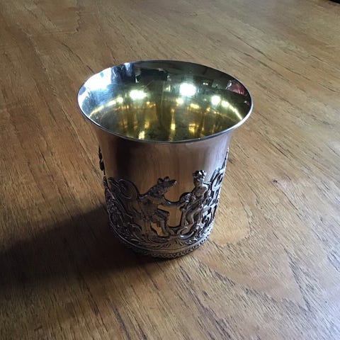 Sølvbæger fremstillet af den københavnske guldsmed Emil Ferdinand Dahl, borgerskab i 1849.