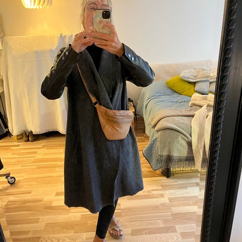 Lækker Onstage frakke i ren uld og med ærmer af skind og lommer.