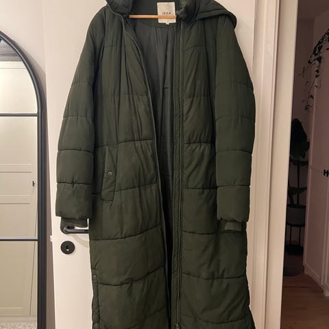 Vinterjakke i størrelse Medium i khaki og beige farver. Jakken har quiltede ærmer og lommer, samt vamset stof på kroppen.