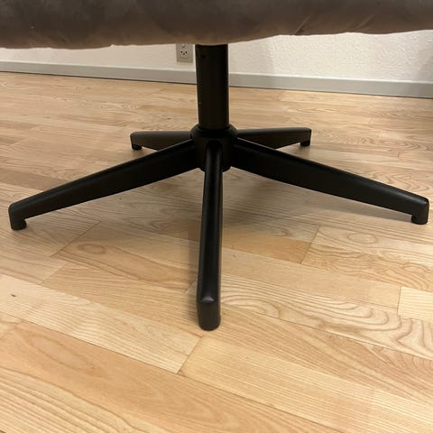 Gode stole, med meget lidt rust på stellet. Den ene "fod" mangler en dut, men den kan måske printes på 3D printer.