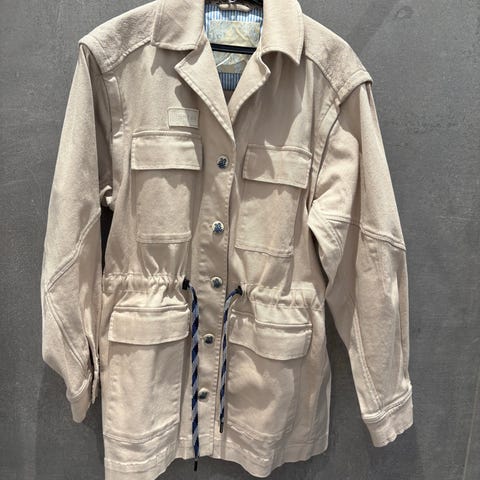 Munthe Eia andet udendørstøj i beige farve, størrelse 36. Materialet består af 50% uld, 30% polyester og 20% akryl. Jakken har to brystlommer med klap og knapper, samt en ternet struktur i stoffet.