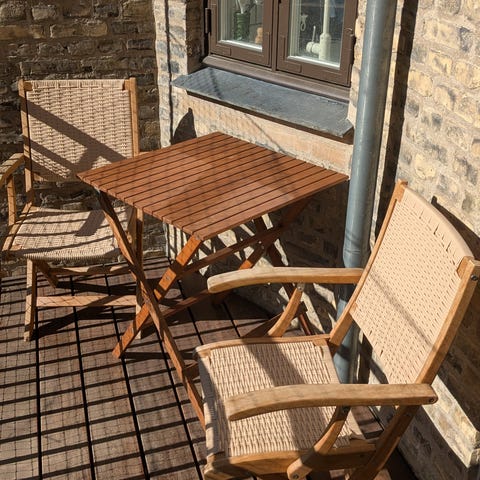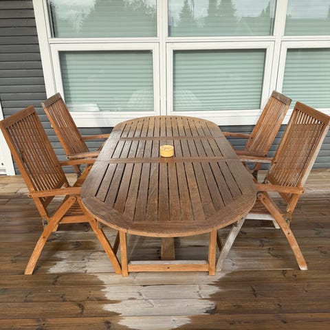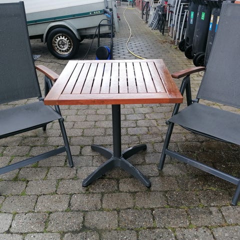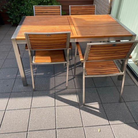 Sæt i teaktræ og kromstel i flot stan, bord er 70 x 70 og 70 høj med indstillige bordben. Er nyvasket deraf den flotte glød i træet