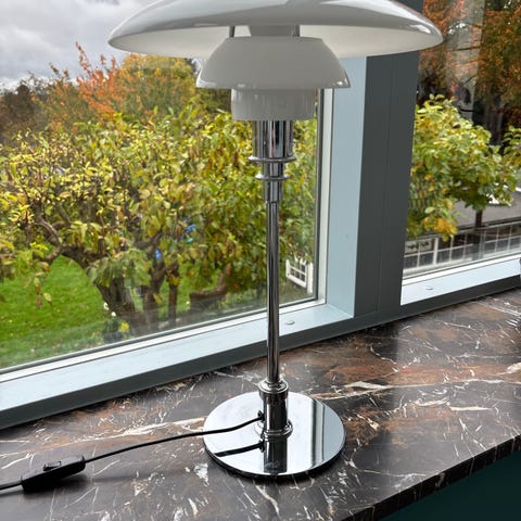 3 lags opal og stel i Chrome. Lampen står pænt uden skår i glas.