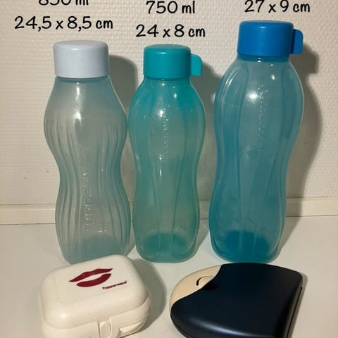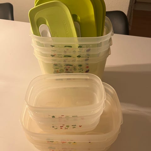 Tupperware bestående af flere beholdere i farverne rød, gul og hvid. Sættet inkluderer pumpeflasker, låg med opdelinger og en større hvid beholder med sort kant. Materialet er plast, og designet er funktionelt til opbevaring og dosering af køkkeningredienser.