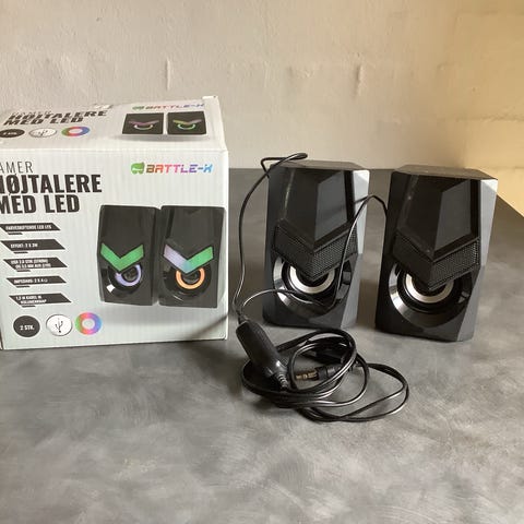Battle-X Gamer Højttalere med LED. Sættet indeholder to højttalere med LED-lys i forskellige farver. Højttalerne tilsluttes via USB og har en samlet størrelse, der gør dem velegnede til brug ved computer eller gaming. Designet med et gamer-tema og LED-effekter for visuel effekt.