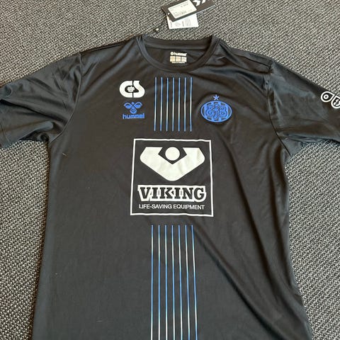Hummel Esbjerg FB fodboldtrøje med blå og hvide striber, størrelse 152 cm, designet til børn. Trøjen har klublogo og sponsormærker på front og ryg, samt autografer fra holdmedlemmer. Fremstillet i materialer egnet til sportsbrug.