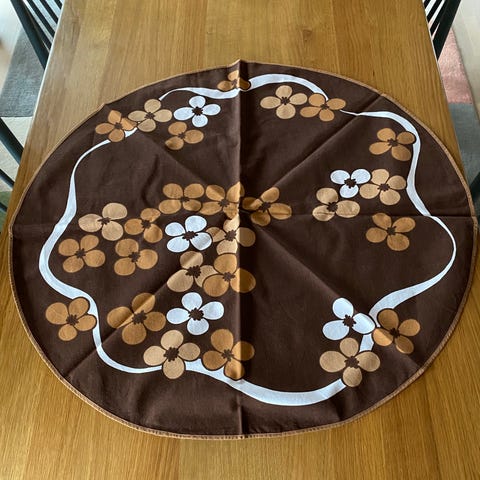 Rund løber / dug fremstillet i hvidt bomuld med broderede detaljer. Dugen har en diameter på 58 cm og er velegnet til brug som borddækning eller dekorativt tekstil. Gammel! Skal stryges.