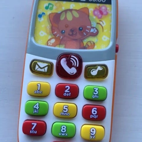 Legetøjstelefon. Knapperne kan trykkes på, den er med lyd. Men selve knapperne er noget slidte på mærkerne. “Se billederne. ✨