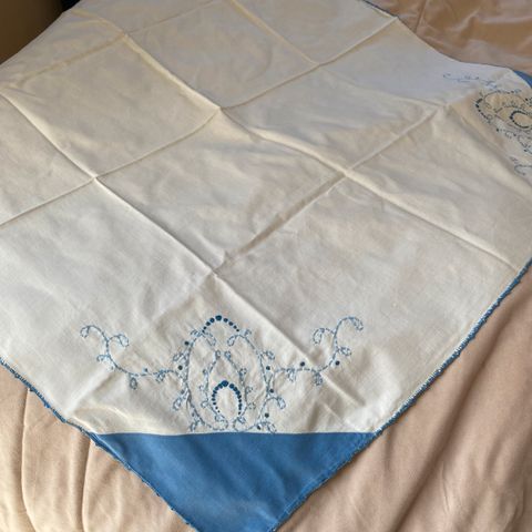 Næsten kvadratisk hvid bomuld med blonder og broderi i gul og sart lysegul på den anden side. Har 2 små pletter som kan vaskes af. Dugen er gammel men intakt.
