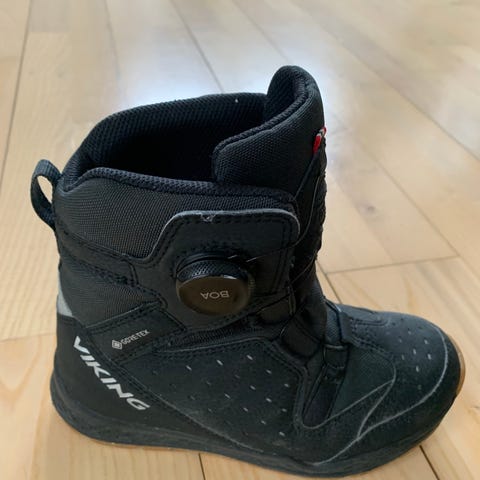 Viking vandrestøvler til børn i størrelse 35. Støvlerne er sorte med orange detaljer og designet til unisex brug. vandafvisende og varme og med snørebånd og en robust konstruktion egnet til udendørs brug.