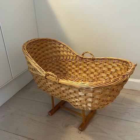 Vugge i hvid flet. Jeg har en hvid sangerend til siderne der bindes på. Der er en skum madrester i bunden men kan også bruges med en babynest, gjorde jeg selv.