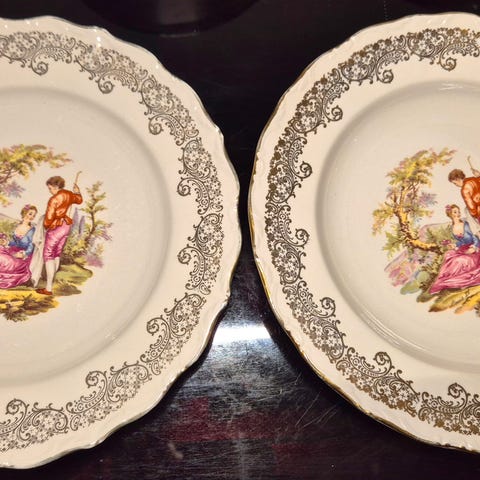 12 stk. dybe tallerkener i hvidt porcelæn med guldkant sælges samlet.