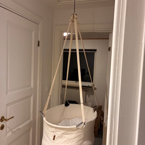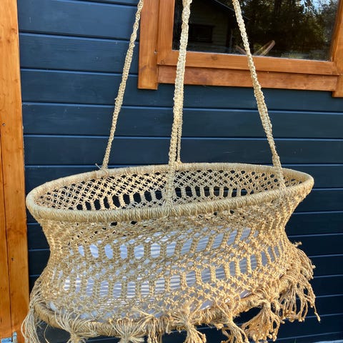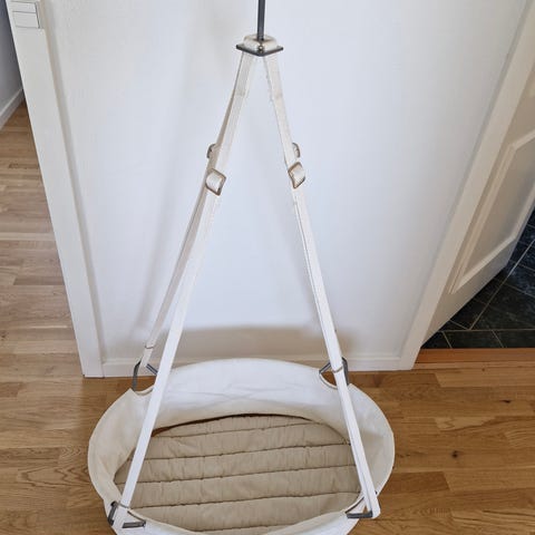 Hængevugge med ophængningsbånd incl. madras og lagen. 100% øko. bomuld. HxLxB: 30x83x50 cm. Pæn og hel stand. Kan afhentes for kr. 450,00