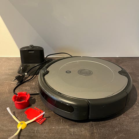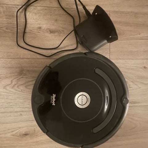iRobot Roomba robotstøvsuger i sort farve. Enheden er designet til automatisk gulvrengøring med indbygget støvsugningsfunktion. Produktet leveres med tilhørende opladerkabel. Velegnet til daglig rengøring af hårde gulve og tæpper.