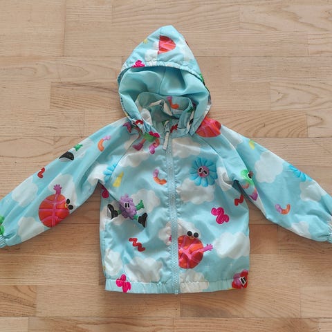 Lækker vindjakke som er super god som overgangs jakke. Hætten kan tages af. Rummelig i størrelsen, min søn brugte den fra ca 10mdr til 1,5 år.