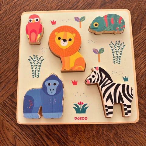 Djeco træpuslespil med tal og sommerfugle, lavet af træ med farverige og mønstrede brikker. Puslespillet indeholder tal fra 1 til 10 og forskellige sommerfugle i flere farver. Velegnet til børn til læring af tal og farver.