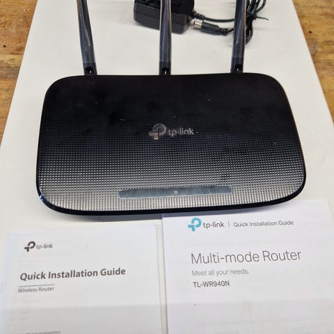 Netværksswitch med 8 porte i sort farve. Enheden er designet til netværksforbindelse og dataoverførsel mellem flere enheder. Den har en kompakt formfaktor og standard netværksporte til tilslutning af kabler. Kun brugt i et halvt år