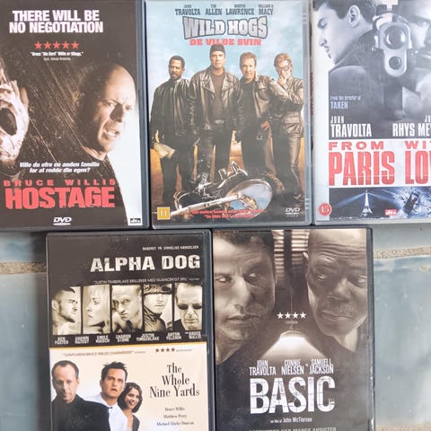 actionfilm på DVD inklusive Sylvester Stallone Rambo, Nicolas Cage Lord of War, Eddie Murphy Rush Hour 3, samt andre titler som Russel Crowe The Next Three Days, Jackie Chan The Spy Next Door, 15 Minutes og Home of the Brave. Filmene er i standard DVD-format med forskellige skuespillere og handlinger inden for action- og thriller-genren.