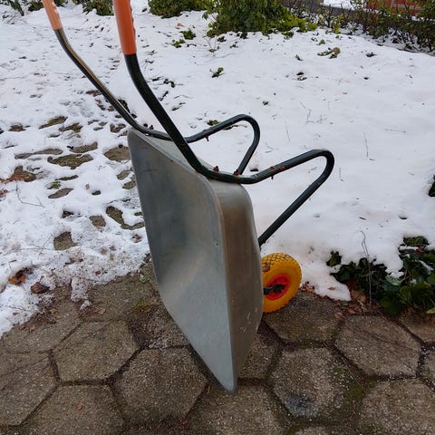 Trillebør barn, - et klassisk arvestykke: min første trillebør til havearbejdet. Den har fulgt mig lige siden - er nu hvidmalet og bruges til bl.a. dekorative blomsterkrukker. L88xB41/37xH30cm, 'lad' 39x34cm, hjul Ø16cm.