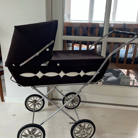 Blå ældre dukkevogn i fin stand. Dukke medfølger.