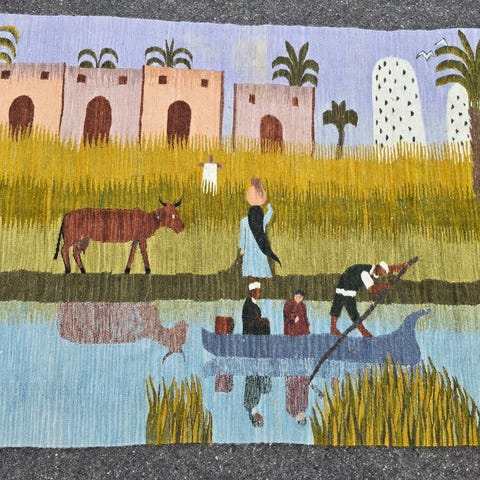Egyptisk Nildalen håndvævet kelim tæppe, 66 x 128, uld på bomuld, nyrenset og i god tilstand. Tæppet viser en rolig ørkenscene med kameler, palmer og traditionelle lerbyggede huse. De bløde sand-, ler- og rosa nuancer giver tæppet et varmt, solbleget udtryk.