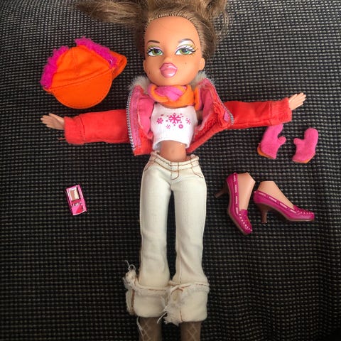 Super fin Bratz Yasmin dukke fra 00’erne i sødt sæt tøj. Pris 60 kr. (Se også mine andre Bratz annoncer)