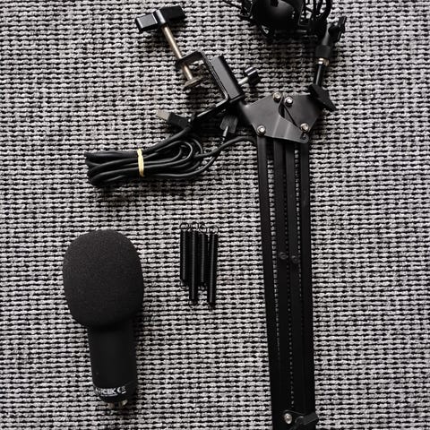 USB mikrofon med tilhørende stativ og vindhætte. Mikrofonen har et klassisk design med metalgitter og integreret kontrolknap. Velegnet til optagelser og streaming. Leveres med USB-kabel til tilslutning til computer.