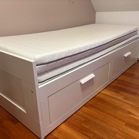 Min datter sælger hendes seng da hun har fået ny med 2 madrasser til. Kan foldes ud til en dobbeltseng