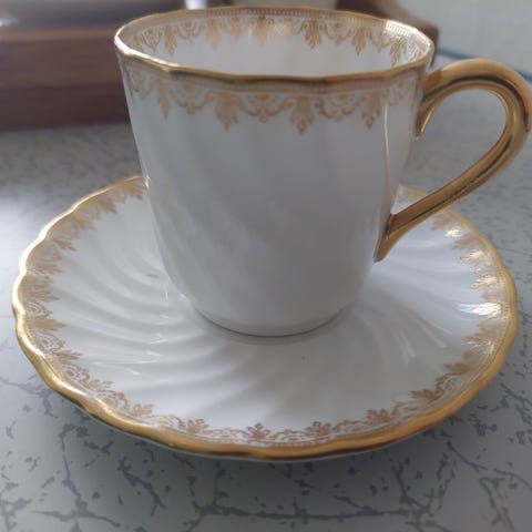 Smukt vintage stel i lyserød/pink med guldkant, ca. 1960–70’erne. Engelsk bone china af høj kvalitet.