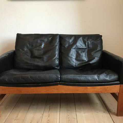 Lækker retro lænestol med sort læderpolstring og træramme i massiv mørk egetræ. Tegnet af Poul M. Volther for FDB. Sofa i samme serie kan tilkøbes (se sidste foto)
