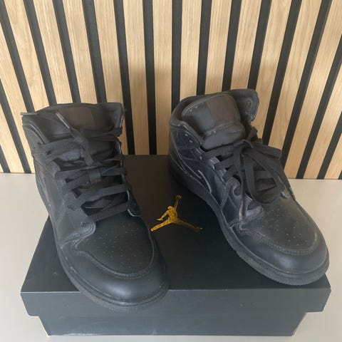 Air Jordan 1 Mid sneakers i størrelse 38. Skoene har en kombination af gul, hvid og sort farve. Fremstillet i lædermateriale. Designet til både hverdag og sport.
