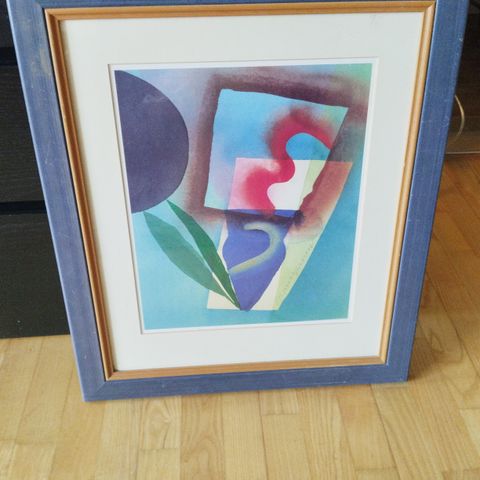 Bakaba maleri fra år 2000 med abstrakt motiv. Maleriet har en ramme og viser en kombination af farver og former. Velegnet til dekorative formål.