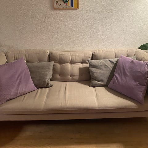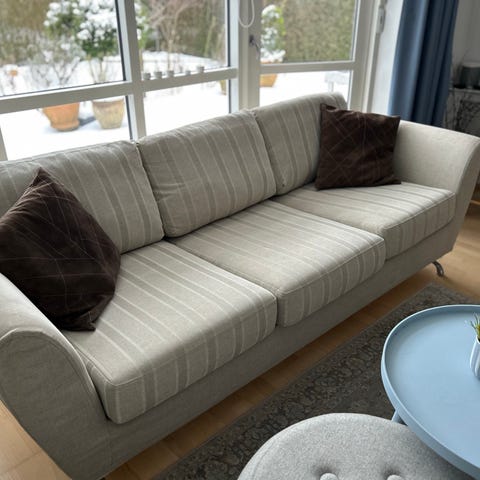 IKEA sofa designet af Achille Castiglioni, 3-personers model i beige stof. Sofaen har tre sædehynder, tre rygpuder med knapdetaljer og to cylindriske armlænspuder. Velegnet til opholdsstue og daglig brug.
