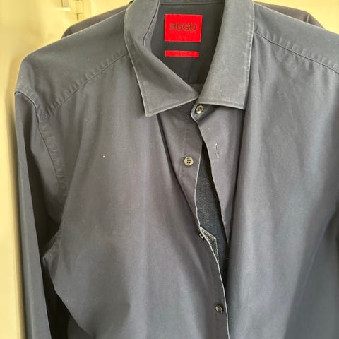 Hugo Boss skjorte i størrelse S til herrer. Skjorten er blå og har et klassisk design med knapper foran og krave.