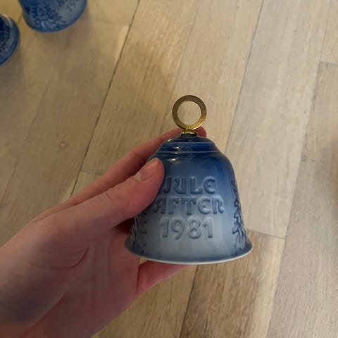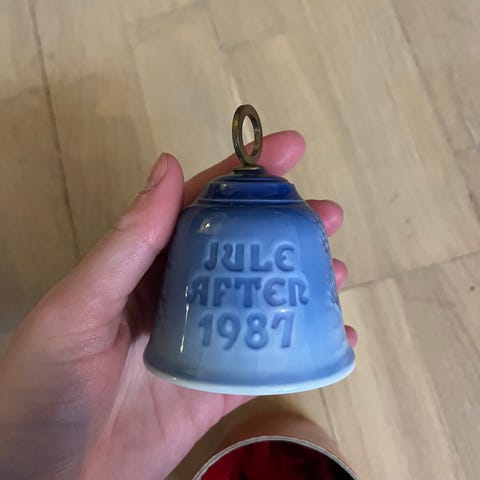 Bing & Grøndahl Jule After 1980 juleklokke i blå farve. Dekorativ ornament til julebrug, fremstillet i porcelæn. Velegnet til samlere eller som juledekoration.