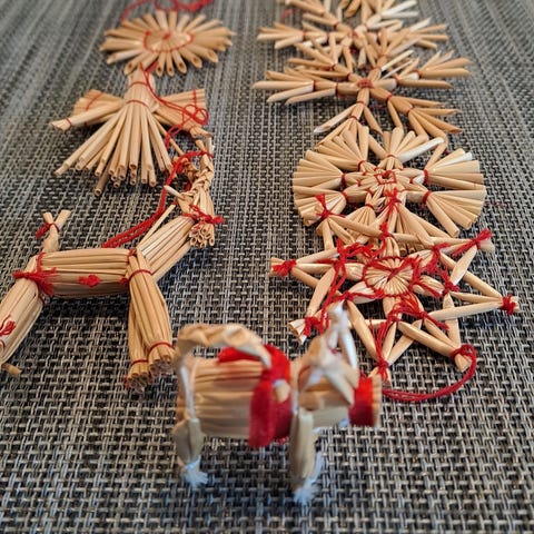Julepynt, vintage i strå og rød tråd. 13 stk