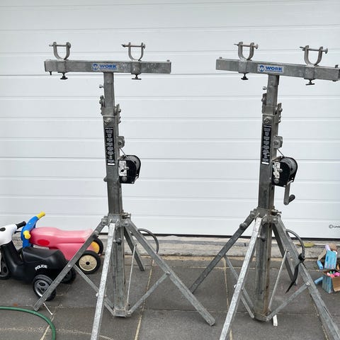 4 stk i 2 kasser. Gamle lamper. Pærer virker. Er pæne og funktionsdygtige. 1 lampe af 4 køre lidt træt i tilt, men virker efter lidt “opvarming” er moddet med powercon.