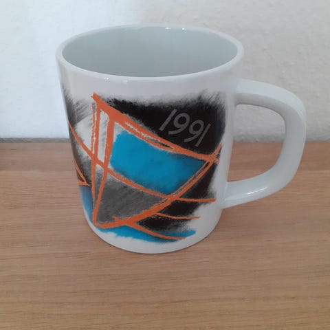 Designet af Inger Hanmann, og er udført i fajance i farverne brun, sort, blå og hvid. 1991. Royal Copenhagen årskrus blev kun produceret i 1991. Sølvplade er indgraveret. "Billund Bageri 60 år"