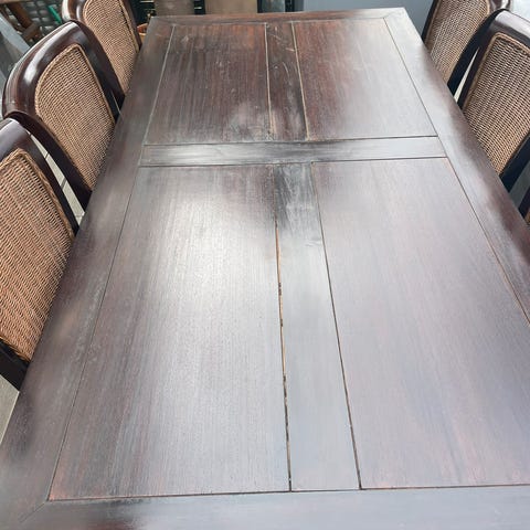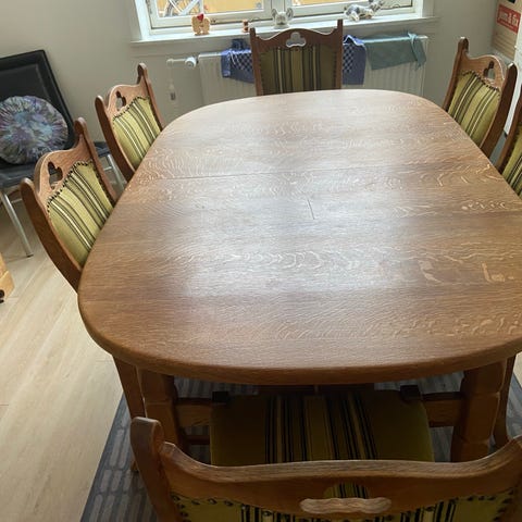 Gedigen egetræs bord med 8 stole