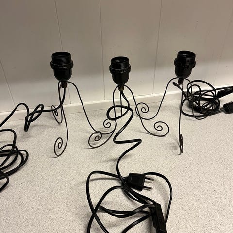 2 stk meget flotte lampefødder sælges samlet. Ca 60 cm høj med pære e27 fatning, uden skærme på. Jeg har haft sølv skærme på men de er i stykker. Sælges derfor uden skærme. De er i sølv og sort. Skærme har ca været 40 bred og 35 cm høj.