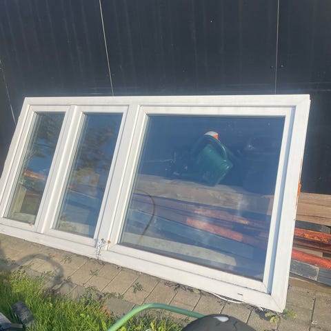 Hvidt vindue med tre sektioner, herunder et stort midterparti og to mindre sidepartier. Vinduesrammen er lavet af plastik og har glasindsatser. Passer til boligbrug og kan installeres i forskellige rum for naturligt lysindfald.
