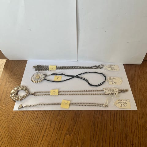 4 stk halskæder af sølv. Nr 1 44 cm lang 925s og vedhæng 925s m/sten pris 375 kr. nr. 2 67 cm 925s pris 250kr nr. 3 40 cm lang 925s vedhæng stemplet men kan ikke tyde mærker m/sten pris 275 kr nr. 4 kæde 40 cm lang 925s vedhæng m/sten 925s pris 275 kr.