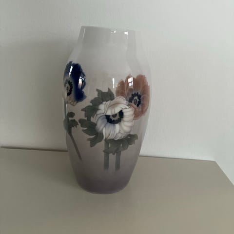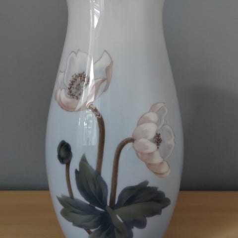 Bing & Grøndahl porcelænsvase med hvide høstanemoner Gl. nr.: 7967-249 Motiv nr.: 7967 Vase-form nr.: 249 Teknik: Underglasur Bundfarve: Tonet blå. Højde 21 cm.
